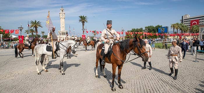 Konak Atatürk Meydanı’na gelen süvari birlikleri, kentin kurtuluşunu simgeleyen tarihi sahneyi bir kez daha canlandırarak, İzmirlilerin alkışları arasında Türk Bayrağı’nı Hükümet Konağı’nın gönderine çekti. İzmir Büyükşehir Belediye Başkanı Tunç Soyer ise törenin ardından Yüzbaşı Şerafettin’i temsil eden Süvari Birlikleri Komutanı’na teşekkür plaketi sundu.