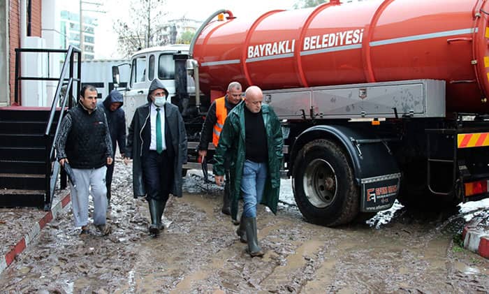 Bayraklı Belediye Başkanı Serdar Sandal, gece saatlerinde başlayan ve baskınlara neden olan şiddetli sağanak yağmurdan etkilenen mahallelerde incelemelerde bulundu. Ekiplerle birlikte sıkıntı yaşanan bölgelere müdahale eden Başkan Sandal, "Yaralarımızı birlikte saracağız. Bu afeti de el birliğiyle atlatacağız. Bayraklı Belediyesi olarak gece gündüz yanınızdayız. Acil durumlar için bize ulaşın" dedi.