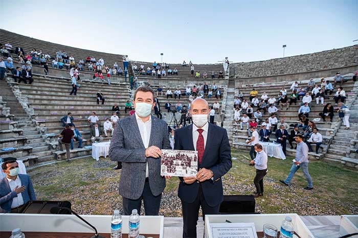UNESCO Dünya Mirası Listesi’ndeki kentler arasında yer alan tarihi zenginlikleriyle ünlü Bergama, ilk kez bir Büyükşehir Belediye Meclisi toplantısına sahne oldu. İlçenin tarihi ve kültürel değerlerinin dünyaya tanıtılmasını hedefleyen Başkan Tunç Soyer’in teklifi üzerine, Meclis’in Ağustos ayı ikinci birleşimi geçmişi 2 bin 400 yıl öncesine dayanan Asklepion Tiyatrosu’nda yapıldı. İzmir Büyükşehir Belediye Meclisi 1800’lü yıllarda parçaları Almanya’ya kaçırılan Zeus Sunağı’nın anavatanı Bergama’ya geri getirilmesi için çalışma başlatma kararı aldı.