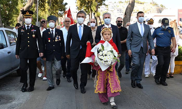 Başkan Yardımcısı Oğuzhan Turan, şöyle konuştu: “Her 7 Eylül’de olduğu gibi bugün de, ‘Ya istiklal, ya ölüm’ diyerek esaret altında yaşamayı kesin bir dille reddeden Başkomutanımız Mustafa Kemal Atatürk önderliğinde, işgal güçlerinden ebediyen kurtulmanın haklı gururu içerisindeyiz. Emperyalizme karşı canlarını ortaya koyarak savaşan aziz şehitlerimizden teslim aldığımız bayrağı ülkemizin her köşesinde olduğu gibi Kuşadası’nda da dalgalandırıyor olmanın coşkusunu ve onurunu bir kez daha hep birlikte yaşıyoruz. Ne mutlu bizlere ki tüm imkânsızlıklara rağmen emperyalist kuşatmayı, kararlılığı ve bağımsızlık aşkı ile yenen bir milletin çocuklarıyız. Ne mutlu bizlere ki, tüm dünyanın önünde saygı ile eğildiği Mustafa Kemal Atatürk gibi çağdaş, ilerici ve öngörülü bir öndere sahibiz” dedi. Kuşadası’nın düşman işgalinden kurtuluşunun 99’uncu yıl dönümünü kutlayan Başkan Yardımcısı Oğuzhan Turan “Türkiye Cumhuriyeti’nin kurucusu Ulu Önderimiz Mustafa Kemal Atatürk ve silah arkadaşları başta olmak üzere Kuşadası’nın kurtuluşuna öncülük eden Mahmut Esat Bozkurt’u ve bu ülke için canlarını feda etmekten çekinmeyen tüm aziz şehitlerimizi rahmet, minnet ve şükran duyguları ile anıyorum” diye konuştu.