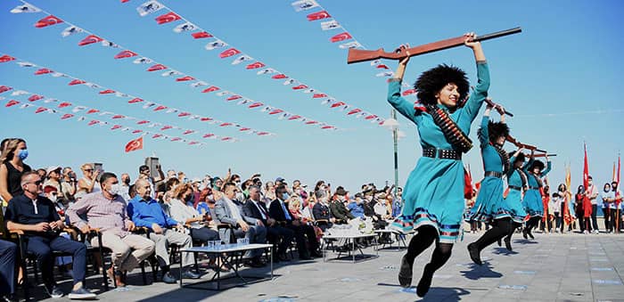 Tören konuşmanın ardından ortaokul öğrencileri tarafından okunan şiirler ve Elifnağme, Kuvayi Milliye Efeleri ile KUFAD halk oyunları topluluklarının gösterileriyle devam etti.
