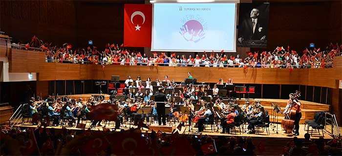Eskişehir Tepebaşı Belediyesi tarafından 15 ay önce kurulan, 7-17 yaş aralığındaki 300 çocuktan oluşan "İki Elin Sesi Var" Çocuk Senfoni Orkestrasına Çocuk Korosu ve Çok Sesli Gençlik Korosu eşlik etti.