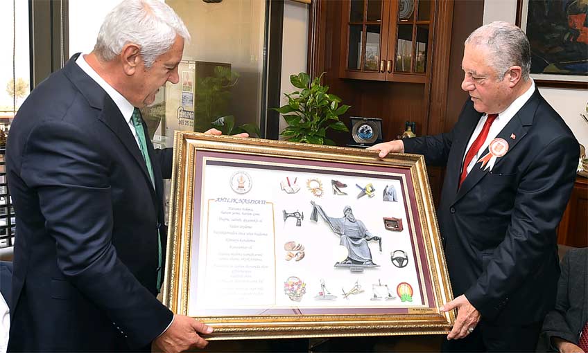 Esnaf teşkilatı olarak İzmir Büyükşehir Belediyesi'nin desteğini her zaman hissettiklerini belirten Zekeriya Mutlu, "129 odamız ve binlerce esnaf adına sizlere teşekkür ediyorum" dedi. Mutlu ziyaret anısına, üzerinde meslekleri simgeleyen objeler bulunan ve ahilik nasihatlerinin yazılı olduğu bir tablo hediye etti.