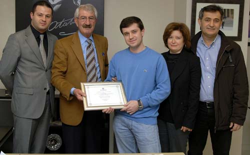 Arman Özdemir (mavi kazaklı), burs ıle ilgili belge ile teşekkür belgesini müdürler koordinatörü Lokman Değirmenci'den aldı(soldan ikinci), KSK Üniversites Hazırlık Şubesi Müdürü Çağdaş Çağlar(solda) ile annesi Özden Özdemir ve babası Mehmet Özdemir ile.