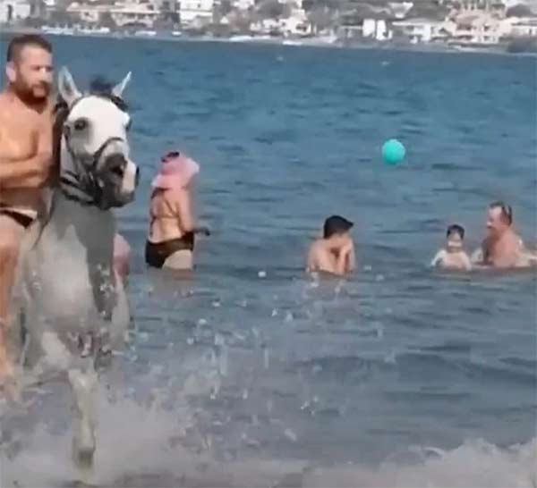 Daha önceleri kedi ve köpekleriyle denize girenleri gördük,ama bu kezde sahilde bulunanların şaşkın bakışları içinde bir kişi atı ile denize girdi.