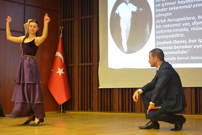 Etkinlikte, Türkiye’de Cumhuriyetin ilk dönemlerine ait vals ve zeybek danslarına ait tarihi video kayıtlarının izlenmesinin ardından, Türk Halk Oyunları Bölümü Yüksek Lisans öğrencisi Ceyda Sarıoğlu ve Türk Halk Oyunları Bölümü doktora öğrencisi Barış Sarıkaya tarafından zeybek gösterisi sergilendi. Atatürk’ün zeybek oyunlarının her türlü kamusal alanda kadınlarla birlikte oynanmasını teşvik eden düşüncesi üzerine kurgulanan dans gösterisi, izleyiciler tarafından büyük alkış aldı. Sunumun sonunda, Konservatuar Müdürü Prof. Dr. Özge Gülbey Usta, sunumu gerçekleştiren Prof. Dr. Özbilgin’e ulu önderin sanata verdiği önemi vurgulayan sunumu için teşekkür etti.