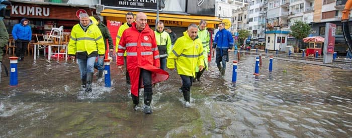 İç ve Orta Körfez’de bulunan gözlem istasyonlarındaki raporlarla deniz seviyesindeki yükselmeyi ölçtüklerini ifade eden İZSU Genel Müdürü Ali Hıdır Köseoğlu, “Hava basıncının bin milibarın altına düştüğünü gözlemledik. Başkanımız da vatandaşlarımızı uyarmıştı. Deniz seviyesi yükseldi ve sorunlu bölgelerimize ekiplerimizi sevk ettik. Gece ikiden beri binin üzerinde personelimizle sahadayız. Mağdur olan vatandaşlarımızla birebir ilgileniyoruz. Apartmanlarda su tahliyesi yapıyoruz. Sosyal Yardımlar ekiplerimiz de vatandaşlarımızın isteklerini yerine getiriyor” şeklinde konuştu.