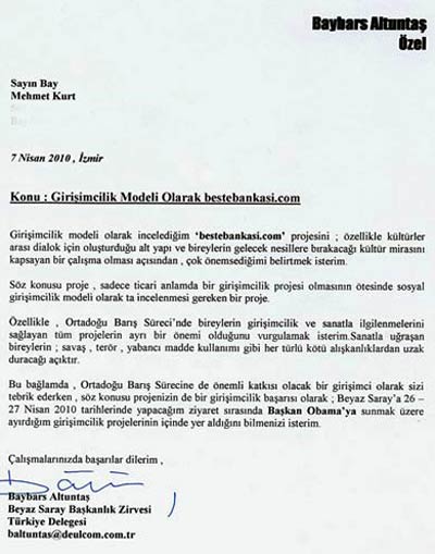 Beste bankasının sadece ticari anlamda bir girişimcilik projesi olmasının ötesinde sosyal girişimcilik modeli olarak ta incelenmesi gerek bir proje olduğunu gözlemlediğini yazan Baybars Altuntaş, Ortadoğu Barış Sürecine de önemli katkısı olacak bir girişimci olarak tebrik ederek 26 27 Nisan 2010 tarihlerinde Beyaz Saraya yapacağı ziyaret sırasında Başkan Obamaya sunacağı girişimcilik projeleri arasında yer aldığını yazmış.