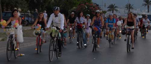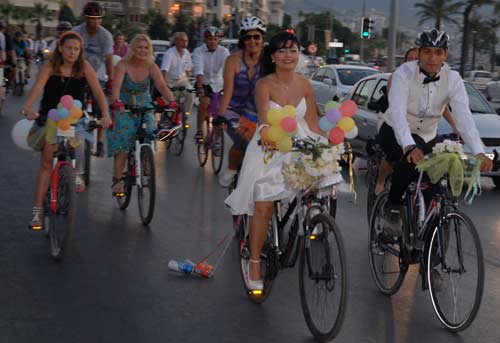 Geçen yıl katıldıkları Kapadokya Bisiklet Festivalinde bisiklet üzerinde tanışan çift, Göztepe Vapur İskelesi önünde dost ve arkadaşlarıyla buluştu. Coşkuyla alkışlanan çift, gelinlik ve damatlığıyla bisiklete bindi. Gelin Sema Berktaşın kaskı yapılı saçlarında durmayınca kaskı çıkardı. Bisikletçilerin karşılıklı bisikletlerini arka tekerlekleri üzerine kaldırarak önlerinden geçen arkadaşlarını selamlamasıyla başlayan hareket, önce deniz kenarındaki yaya yolundan, daha sonra ise sahil bulvarındaki ana yoldan sürdü. Arkasında içecek tenekelerinin bağlı olduğu Gelin ve damadın bisikletlerinin arkasında yaklaşık 50 bisikletlik kortej, yoldan geçen araç sürücülerinin ve apartmanlardan izleyenlerin alkışları arasında nikah töreninin ve düğünün yapılacağı Tarihi Kemeraltı Çarşısında bulunan Abacıoğlu Hana geldi.