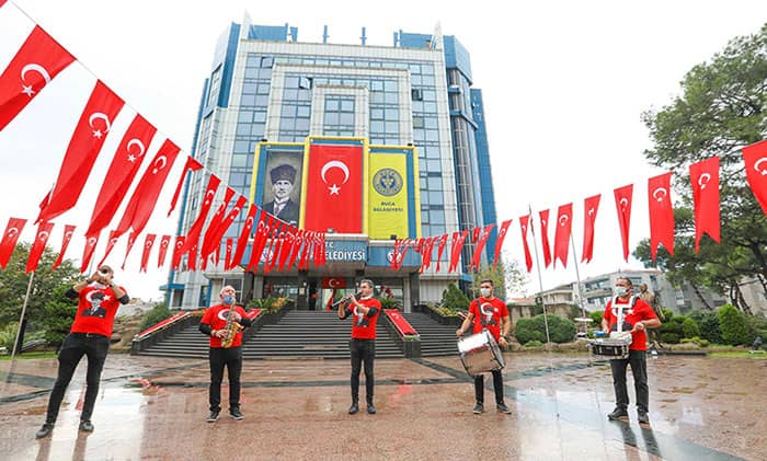 Ulu Önder Mustafa Kemal Atatürk’ün “Benim en büyük eserim” diyerek Türk milletine armağan ettiği Cumhuriyet’in 97’inci yaşı, Buca’da coşkuyla kutlandı.Buca Belediyesi, bu yıl yurt genelinde artmaya devam eden koronavirüs (Covid-19) salgınının gölgesinde kutlanan Cumhuriyet Bayramı’nın coşkusunu tüm kente yaydı. Belediye hizmet binası önü başta olmak üzere Buca’nın dört bir yanı binlerce Türk bayrağı ve Atatürk resimleriyle donatıldı.