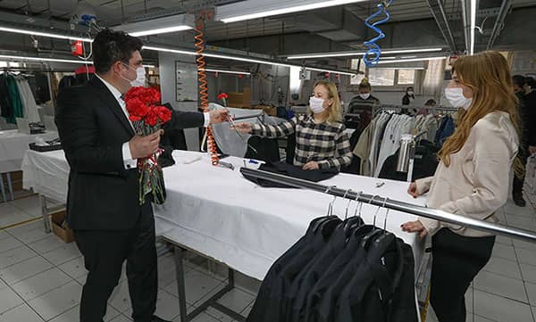Fabrikada üretim atölyelerini ziyaret ederek, çalışanlara kırmızı karanfil ve içerisinde İstanbul Sözleşmesi ve kadına şiddete karşı farkındalık broşürlerinin de yer aldığı hediye paketlerinin dağıtımını yaptı.