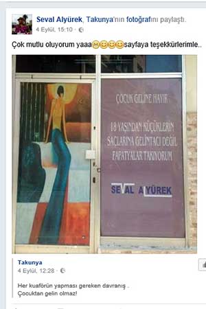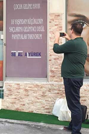 Hatay semtinde kuaför salonu bulunan Seval Alyürek, 12 yıl önce yaşadığı, zaman zaman tekrar etmesi sonucu iyice belleğine yerleşerek gün geçtikçe de içine oturan çocuk gelinlere tepkisini salonunun camına taşıdı. “ÇOCUK GELİNLERE HAYIR. 18 YAŞINDAN KÜÇÜKLERE GELİN TACI DEĞİL PAPATYA TAKIYORUM” sözleri öylesine ilgi gördü ki, salonunun önü fotoğraf çekimlerine, özçekimlere sahne oldu.