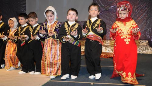 Konuşmaların ardından sahne alan minikler, gösterilerin ilk bölümünde çayda çıra, çiftetelli oyunları ile Üsküp, Karadeniz, Silifke ve Trakya yörelerinin oyunlarını sundu. İkinci bölümde Arap, Latin, Hint, Polonya ve İspanyol dansları ile dünya danslarından örnekler veren minikler ayakta alkışlandı. Gecenin finalinde ise gösteriye katılan bütün gruplar sahneye çıkarak hep birlikte Onuncu Yıl Marşını söyledi.