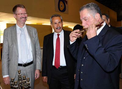 Vali Vekili Fatih Ahmet Kurt ve Başkonsolos Stefan Scheider ile birlikte standları ziyaret eden Büyükşehir Belediyesi Başkan Vekili Dr. Sırrı Aydoğan, armonika (mızıka) çaldı.