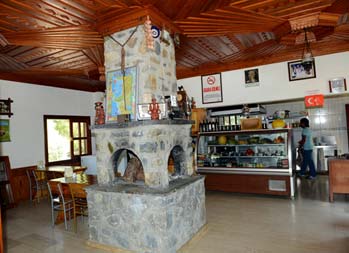 Kapalı bölümünün ortasında yer alan dört yanlı şöminenin etrafı kışın Şömine muhabbetlerine ev sahipliği yapıyor. yöresel desenlerden oluşan ahşap dekorasyonu ise Ula yöresinin ahşap ustası Nail Çakırhan imzası taşıyor.
