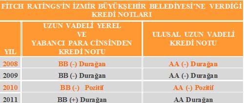 İzmir Büyükşehir Belediyesinin mali yapısını 4. kez değerlendiren Fitch Ratingsin raporunda, not artırımının, İzmirin Hazine Müsteşarlığına 2006 yılında 1,5 Milyar TL olan borç benzeri sayılan yükümlülüğünün, 2010 yılı sonunda 343 Milyon TLye düşmesinin etkili olduğu ifade edildi. Söz konusu raporda, kurumun tüm borçlarının, diğer belediyelere kıyasla üstün olduğu 2010 yılındaki cari dengesiyle değerlendirildiğinde, 1.6 yıl içerisinde geri ödenebilir olduğu belirtildi.