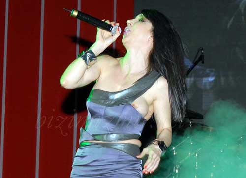Kıyafetinin kenarından fırlayan göğsünün farkına varmadan başladığı konserinin bir bölümününde göğüs şov sergiledi.