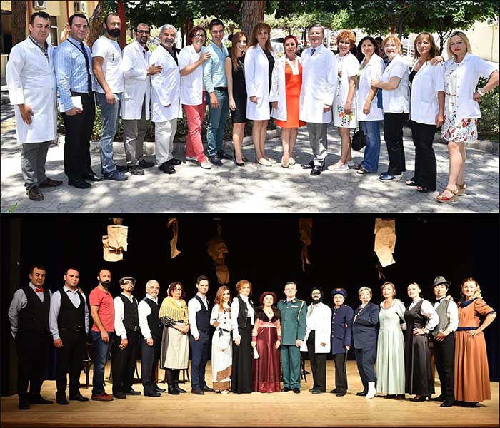 Kimi doktor, kimi hemşire, kimi de idari görevli. Yaşamlarının büyük bir bölümünü toplum sağlığına ayıran İzmir Büyükşehir Belediyesi Eşrefpaşa Hastanesi çalışanları, mesleki birlikteliklerini, sanat dünyasına da taşıdı. Sağlık personeli bu kez beyaz önlükler yerine sahne kostümleriyle, kendilerini izleyen sanatsever dostlarının karşısında ter döktü. 108 yıllık Eşrefpaşa Hastanesi tarihinde ilk kez, hastanenin farklı birimlerinde görev yapan personel bir araya gelerek Tiyatro Kulübü kurdu ve ortaya son derece başarılı bir ekip çıktı. Amerikalı oyun yazarı Neil Simonun Anton Çehovun hikayelerinden oyunlaştırdığı tek perdelik oyunu geçtiğimiz ay ilk kez Güzelyalı Kültür Merkezi'nde sahneleyen oyuncular, bu kez Kültürpark İzmir Sanat Merkezinde sahneye çıktı. Oyunu izleyenler arasında, Büyükşehir Belediye Başkanı Aziz Kocaoğlu ile eşi Dr. Türkegül Kocaoğlu, Genel Sekreter Pervin Şenel Genç ve başhekim Dr. Serdar Pedükcoşkun'un yanı sıra Büyükşehir Belediyesi yöneticileri ve oyuncuların mesai arkadaşları da vardı. Salonu dolduranlar profesyonel oyuncuları aratmayan sağlık çalışanlarının sahnelediği komedi türündeki oyunu kahkahalara boğularak izledi. İzmir Büyükşehir Belediye Başkanı Aziz Kocaoğlu ve Eşrefpaşa Hastanesi Başhekimi Dr. Serdar Pedükcoşkun, gösterinin ardından yönetmen ve oyuncuları çiçek vererek kutladı.