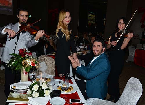Sevgililer Gününü kutlamak isteyen İzmirliler, eğlence merkezlerine akın etti. Hilton İzmirde hazırlanan eğlence programında Aegean Band; Sevgililer Günü için özel hazırladığı repertuvarıyla unutulmaz bir gece yaşattı. Sevgilisine evlilik teklifi yapmak için bu günü bekleyenlere destek Aegean Banddan geldi ve erkek ve hanım kemancıların müzikleri eşliğinde diz çökerek evlilik teklifini yaptı ve tek taş yüzüğü sevgilinin parmağına taktı.