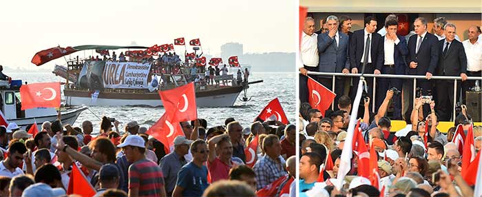 15 Temmuz Darbe Girişimi'nin ardından alanlara inen Cumhuriyet Halk Partisi'nin, İzmir Gündoğdu Meydanı'nda düzenlediği "Cumhuriyet ve Demokrasi' mitingine on binlerce İzmirli katıldı. Ellerindeki Türk bayraklarıyla meydanı dolduran katılımcılar, "Türkiye laiktir, laik kalacak", "Mustafa Kemal'in askerleriyiz" sloganları eşliğinde cumhuriyete ve demokrasiye olan bağlılıklarını dile getirdi. İzmir Büyükşehir Belediyesi ve ilçe belediyeler ile sivil toplum kuruluşları ve siyasi partilerin de destek verdiği mitingi Büyükşehir Belediye Başkanı Aziz Kocaoğlu, AKP İzmir İl Başkanı Bülent Delican'ın yanı sıra AKP ve CHP'li milletvekilleri ile birlikte izledi.