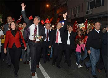 Bize Cumhuriyeti kazandıran önderimiz MustafaKemal Atatürk ve silah arkadaşlarına, 90 yıldır bu Cumhuriyeti kurmak,geliştirmek ve ilerletmek için canlarını feda eden tüm şehitlerimize, tümgazilerimize ve Gezi Parkı şehitlerimize şükran ve minnetlerimizi sunuyoruz.Işıklar içinde yatsınlar. 40 kilometrelik Körfezin her yerinde binler değil,yüz binler değil; bugün en az 1,5 milyon İzmirli sokaklarda, meydanlarda,Cumhuriyeti kutluyor. Türkiyenin en aydınlık kenti İzmirden tüm Türkiyeye vedünyaya cumhuriyeti koruyacağımıza, Atatürk ilke inkılaplarını koruyacağımızasöz veriyoruz. İzmir Türkiyeye ve dünyaya söz veriyor. Türkiyenin engelişmiş, en demokrat kentinden Atatürkü en çok seven kentten söz veriyoruz.Yaşasın Türkiye Cumhuriyeti, yaşasın Türkiye, yaşasın bağımsızlık, yaşasındemokrasi, yaşasın laiklik.