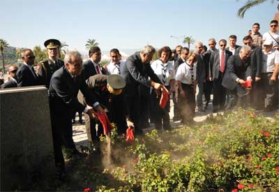 Atatürk Anıtına çelenk sunma töreni, ilk olarak Bakanlar Ertuğrul Günay ve Binali Yıldırımın Hükümet adına çelenklerini sunmasıyla başladı. Tüm kurumların çelenklerinin Anıta bırakılmasından sonra saygı duruşunda bulunuldu ve İstiklal Marşı hep birlikte söylendi. Daha sonra İzmir Büyükşehir Belediye Başkanı Aziz Kocaoğlu, Anıt Şeref Defterini imzaladı. Başkan Kocaoğlu deftere şunları yazdı: