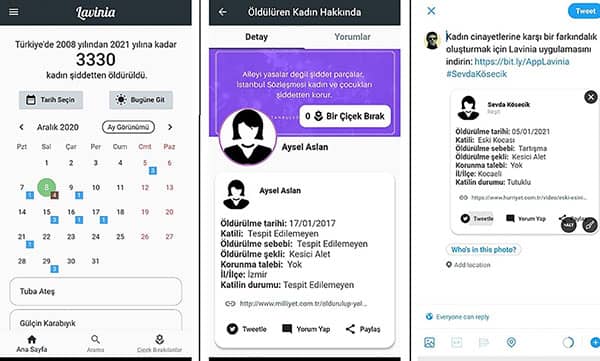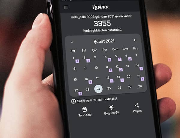 Çalışmalarını Yaşar Üniversitesi Kuluçka Merkezi Minerva’da sürdüren Yazılım Mühendisliği Bölümü öğrencisi Mustafa Mert Aladağ, ekip arkadaşlarıyla birlikte, kadın cinayetlerine dikkat çekmek için bir mobil uygulama geliştirdi. İsmini ölüm çiçeği olarak bilinen Lavinia’dan alan ve 8 Mart Dünya Kadınlar Günü öncesinde yayınlanan uygulamada, 2008 yılından günümüze değin öldürülen kadınların isimleri, neden ve kim tarafından öldürüldükleri yer alıyor.