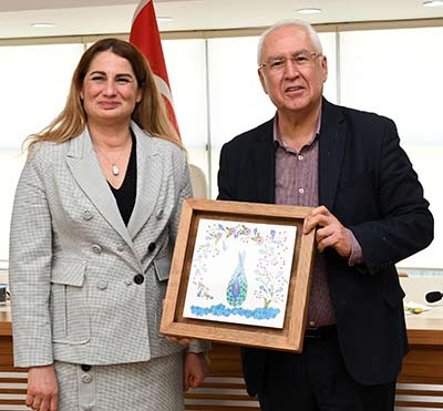 Konuşmaların ardından eğitimciler Başkan Selvitopu'na çiçek ve el emekleriyle yaptıkları eserleri armağan ettiler. Daha sonra ziyaretin anısına toplu fotoğraf çektirildi.