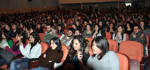 Söyleşi dizi çekiminin uzaması nedeniyle yaklaşık iki saatlik gecikmeyle başladı. Söyleşiye geç kalmalarından dolayı öğrencilerden özür dileyerek başlayan oyuncular, öğrencilerin sorularını içtenlikle yanıtladılar. Özellikle dizi çekimlerinin uzun sürmesinden dert yanan oyuncular; Çalışma saatleri dışında ancak dinlenmeye fırsat bulabiliyoruz bu da yaşantımızı zorlaştırıyor, kendimize vakit ayıramıyoruz dedi. Oyunculuk eğitimi almadan bu sektöre tesadüfen adım atığını söyleyen Pelin Karahan; Kendimi bu konuda geliştirmek için çok çalışıyorum ve ilk fırsatta bu konuda eğitim görmek istiyorum dedi.