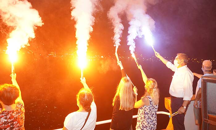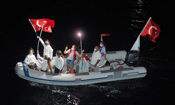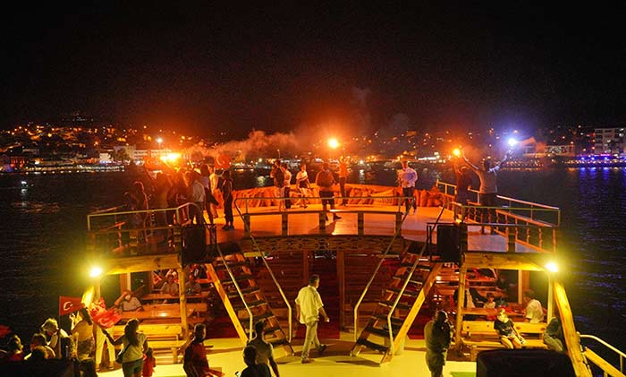 Akşam saatlerinde ise Cunda ve Ayvalık arasında yüzlerce teknenin karşılıklı olarak katılımıyla adeta bir şölen yaşandı. Meşaleler gecenin karanlığını aydınlattı. Tekneler ile kutlamaya katılan vatandaşlar marşlara eşlik ederek Ayvalık iç körfezde adeta dev bir koro oluşturdular.