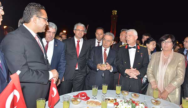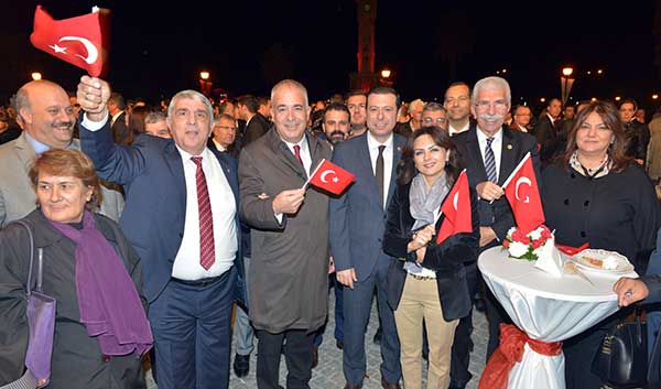 Konak Meydanı Hükümet Konağı önünde düzenlenen resepsiyona İzmir Büyükşehir Belediye Başkanı Aziz Kocaoğlu, Ege Ondu Komutanı Orgeneral Abdullah Recep, Güney Deniz Saha Komutanı Koramiral Hasan Uşaklıoğlu, üst rütbeli subaylar, AK Parti Milletvekilleri Atilla Kaya ve Necip Kalkan, Bornova, Karabağlar; Karşıyaka Belediye Başkanları, Gaziler, Şehit Yakınları ve çok sayıda vatandaş katıldı. Cumhuriyet Resepsiyonu bir ilke sahne oldu ve pasta kesiminin ardından şehitler için mevlüt okutuldu.