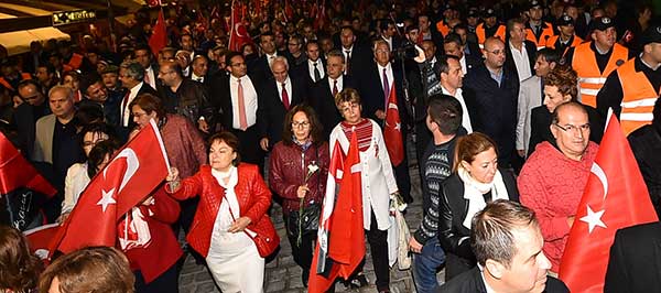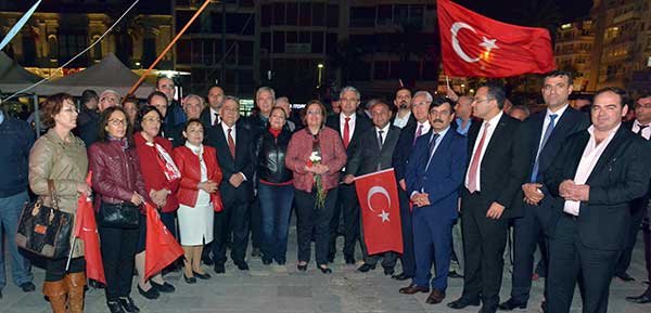 ülkemizin kurucusu, kurtarıcısı ulu önder Mustafa Kemal Atatürk'e, silah arkadaşlarına, şehit ve gazilerimize minnet ve şükranlarımızı ifade etmek üzere kutlamalar yapıyoruz. Özellikle en büyük bayramımız olan 29 Ekim Cumhuriyet Bayramı'nda gerçekleştirdiğimiz etkinliklerle birlik ve beraberliğimizi sağlıyoruz. Bugün Atatürk'ün en çok sevdiği, annesini emanet ettiği kentten, İzmir'den tüm İzmirli hemşehrilerimizle birlikte haykırıyoruz. Biz İzmir'de biriz; bütünüz. Ülkemizin bağımsızlığı, Cumhuriyetimiz'in korunması, kollanması, gelişmesi, demokrasi, insan hakları, hukuk devleti için sonuna kadar mücadele edeceğimize söz veriyor, ant içiyoruz" dedi.