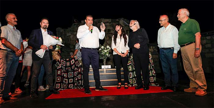 Seferihisar Belediye Başkanı İsmail Yetişkin oyunun ardından Kaleiçini dolduran tüm sanatseverler adına Gezen ailesine çiçekle teşekkür etti.