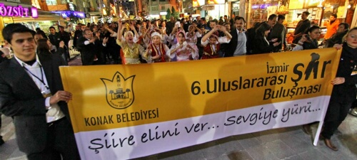 PEN, Türkiye Yazarlar Sendikası ve Edebiyatçılar Derneği işbirliği ile Konak Belediyesinin ev sahipliğinde, 6ncı Uluslararası İzmir Şiir Buluşması coşkuyla devam ediyor. Makedonyanın konuk ülke, oyuncu, şair ve çevirmen Ülkü Tamerin onur konuğu olarak katıldığı buluşma, Kıbrıs Şehitleri Caddesinde ilk kez düzenlendi. Buluşma Şiire elini ver, sevgiye yürü ismi verilen etkinliğiyle renklendi. Makedonya Göçmenleri Derneği Halk Oyunları ekibinin de destek verdiği yürüyüşe, Konak Belediye Başkanı Dr. Hakan Tartan, konuk şairlerle, yüzlerce İzmirli şiirsever katıldı.