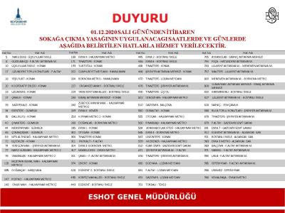 ESHOT otobüsleri, kısıtlılık günleri boyunca 91 ana hatta seferlerine devam edecek. Sağlık çalışanlarına özel güzergâhlarda hizmet veren özel otobüs servisleri de her gün belirli saatlerde seferlerine devam edecek. Metro ile Konak ve Karşıyaka tramvaylarında seferler 06.00 – 00.20 saatleri arasında 30 dakikada bir yapılacak. İzmir Büyükşehir Belediyesi ve TCDD ortaklığıyla işletilen İZBAN’da seferler, 24 dakikada bir olacak. İZDENİZ’de 1, 2 ve 3 Ocak günlerinde; yalnızca yolcu gemileri çalışacak; araba vapurları sefer yapmayacak. Bostanlı-Karşıyaka-Konak iskeleleri arasında ring seferi yapacak gemiler, 08.00 - 11.00 - 14.00 - 17.00 - 20.00 saatlerinde Bostanlı’dan; 08.30 - 11.30 - 14.30 - 17.30 - 20.30 saatlerinde Konak’tan kalkacak.