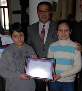 Hakan Harmanda'nın ödülünü dershane arkadaşı Ezgi Aysu Şahin ile dershane İrfan Albayrak verdi.