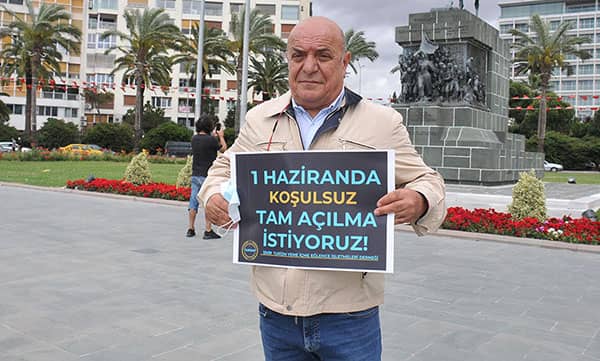 Dokuz aydır kapalı olmaktan dolayı yüklü miktarda borçlu olduklarını belirten İzmir Gastronomi Yeme İçme Ve Eğlence Yerleri İşletmecileri Derneği Başkanı Hami Torcu, “ülkenin yüzde doksanı açık. Toplu ulaşım, fabrikalar, pazarlar, marketler, avm’ler, havayolları ve kapalı ortamdaki ofisler faaliyetlerine devam ederken bizim sektörümüzdeki işletmeler dokuz aydır kapalı. Bu yüzden 70 bin işletme iflas etti. Çalışanlar, müzisyenler intihar ettti. Birikmişimizi kullandık, varımızı yoğumuzu kaybettik borç batağındayız. Artık sesimizi duymalarını istiyoruz” dedi.